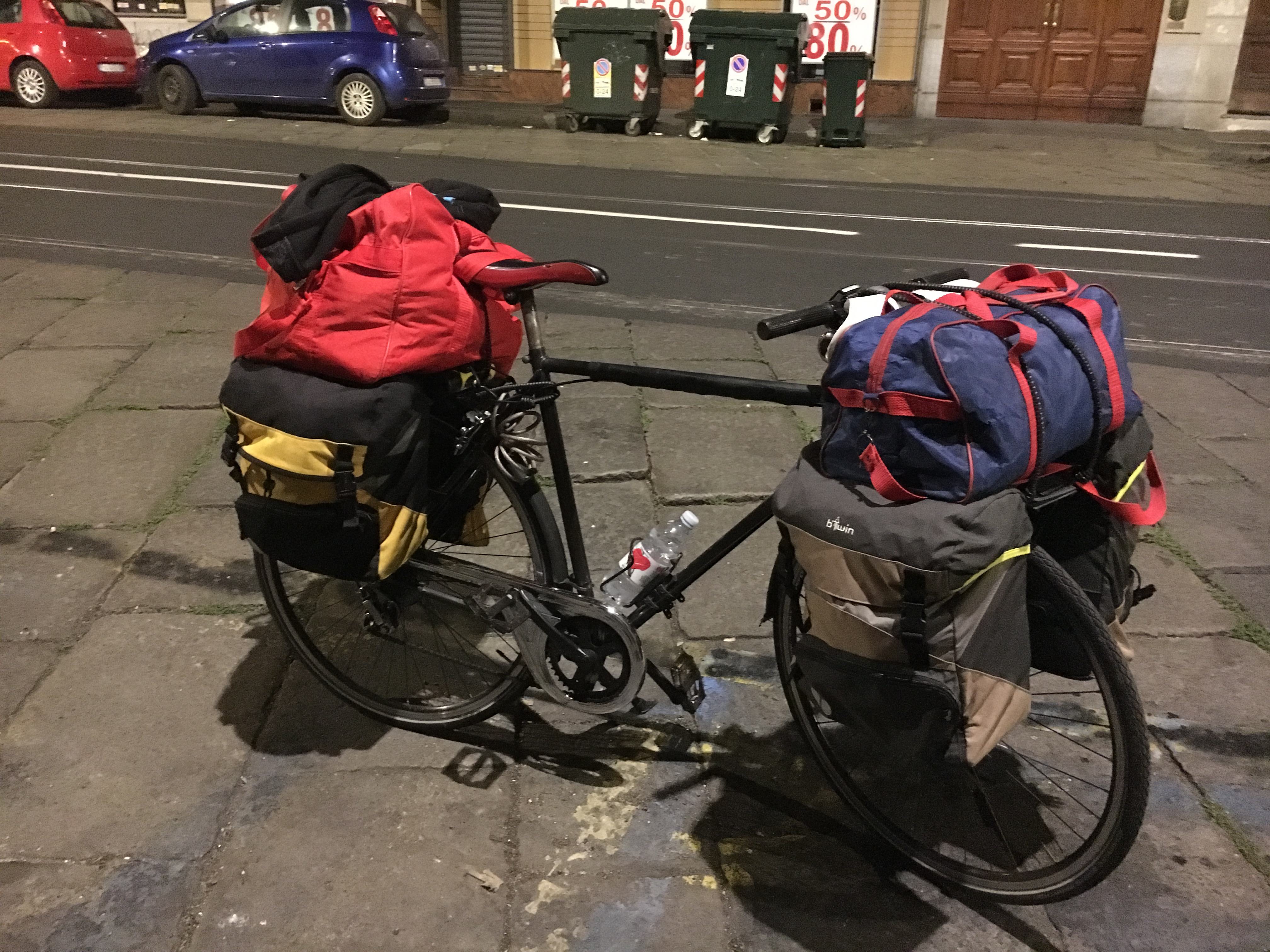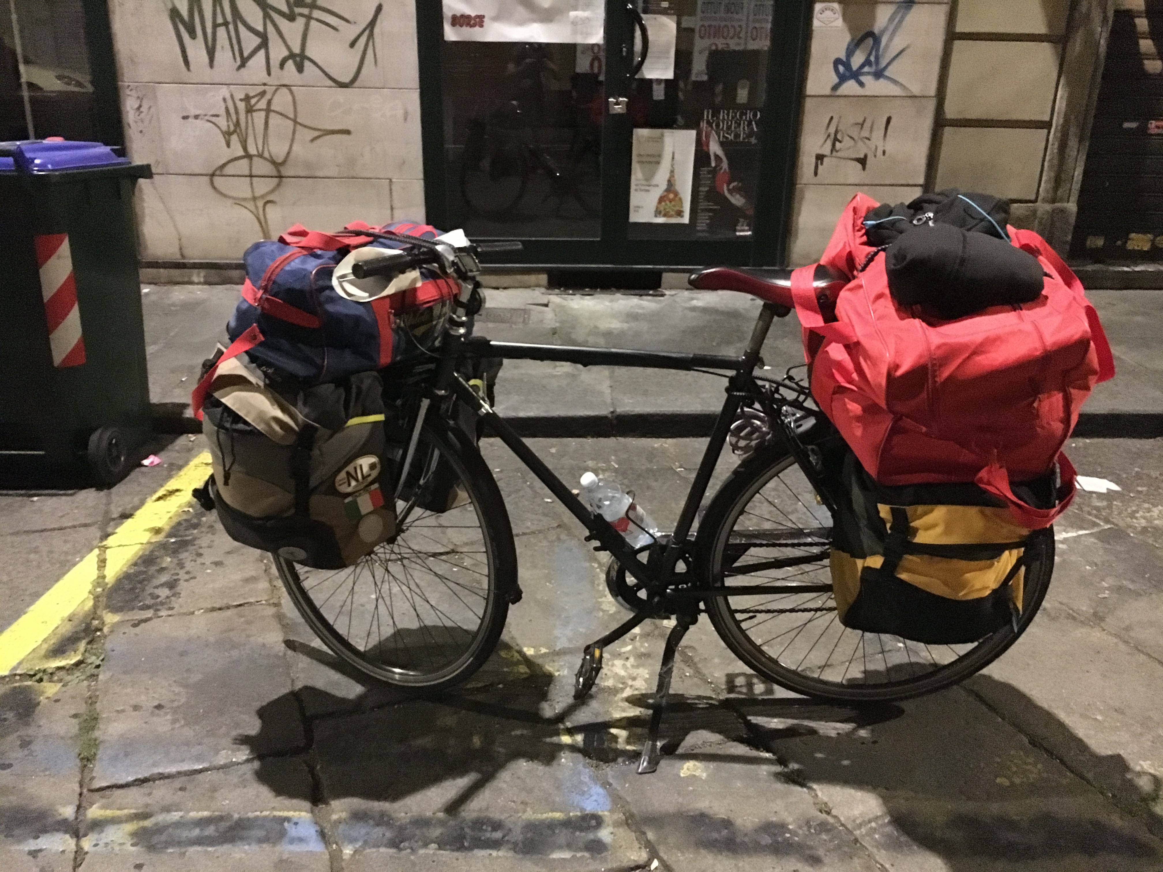 Così spesso la mia bici da città è più simile ad una bici da cicloviaggiatore, tutta carica con le diverse borse che mi servono a contenere gli oggetti per l’ufficio, gli oggetti che utilizzo in palestra o piscina e poi la borsa del pronto intervento in bici, con camere d’aria, pompa, attrezzi, elastici e luci di scorta.